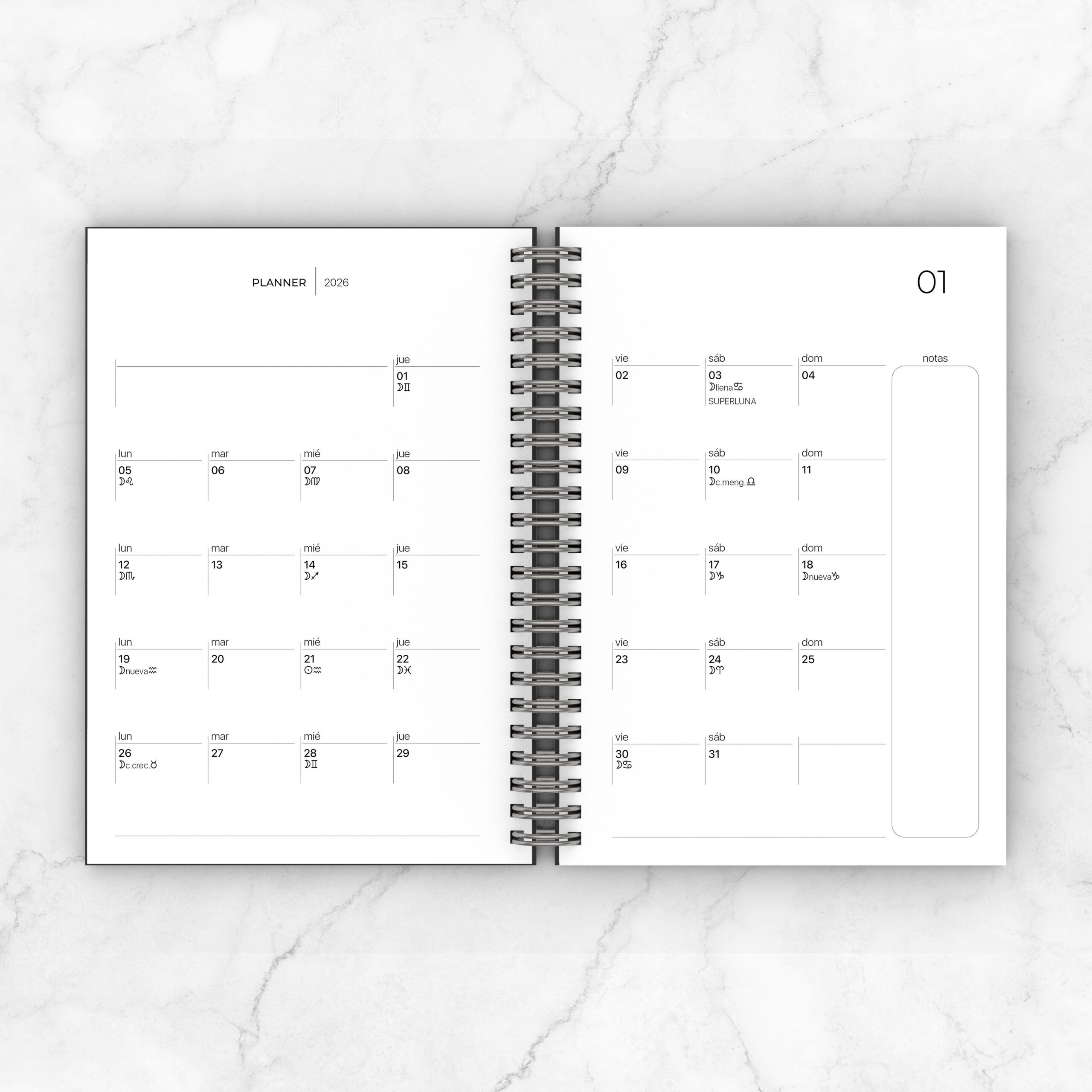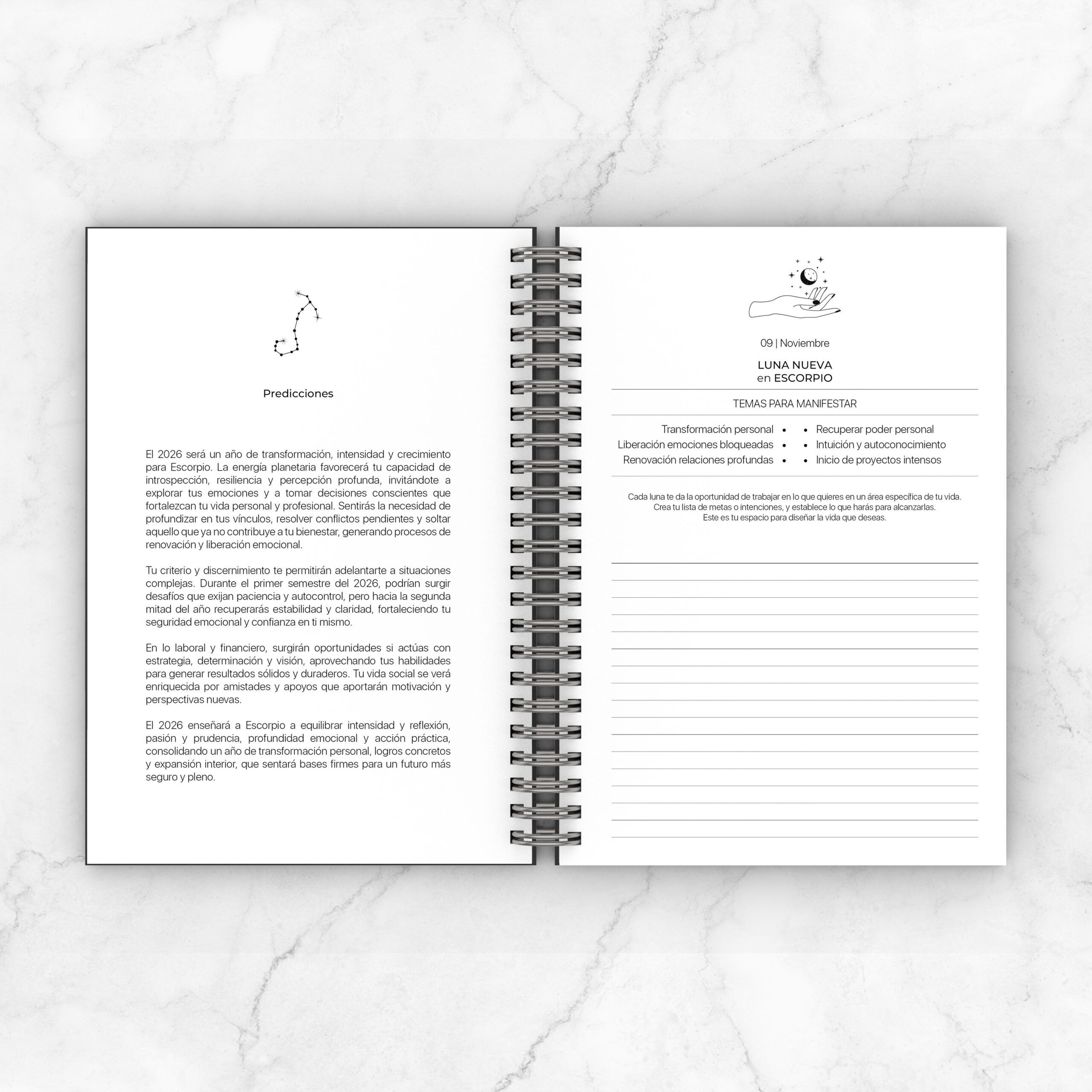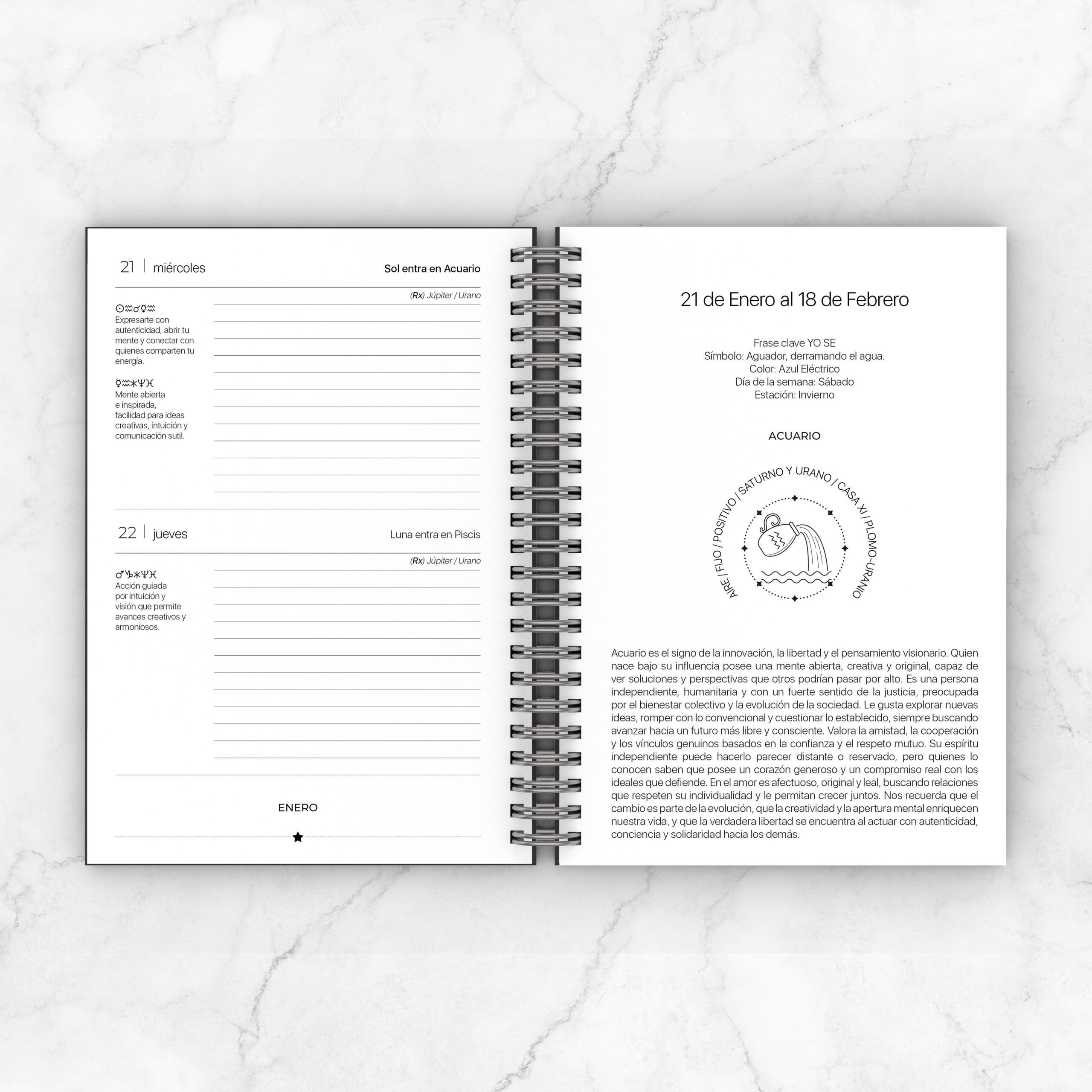 Anatomía de la Carta Natal / Conocimientos básicos / Zodiaco / Ascendente / Elementos / Cualidades / Polaridades / Planetas / Aspectos / Planetas retrógrados / Casas / Fases lunares / Particularidades de la luna / Lilith, la luna oscura / Luna rosa, azul y luna de sangre / Superluna y Microluna / Eclipses / Rituales para eclipses / Alineaciones planetarias / Origen y costumbres de los días / Lluvia de Meteoros / Dibujo para hacer tu carta astral y anotar todas la especificaciones / Hojas de notas / Metas anuales / Fechas importantes / Planners mensuales con indicador de luna, sol, eclipses y alineaciones planetarias / Agenda dos días por página con renglones, tránsitos planetarios y su energía / Características de los signos / Predicciones / Intenciones y manifestaciones para cada luna llena y luna nueva, y a los 6 meses y a fin de año para evaluar si alcanzaste tus metas / Índice telefónico