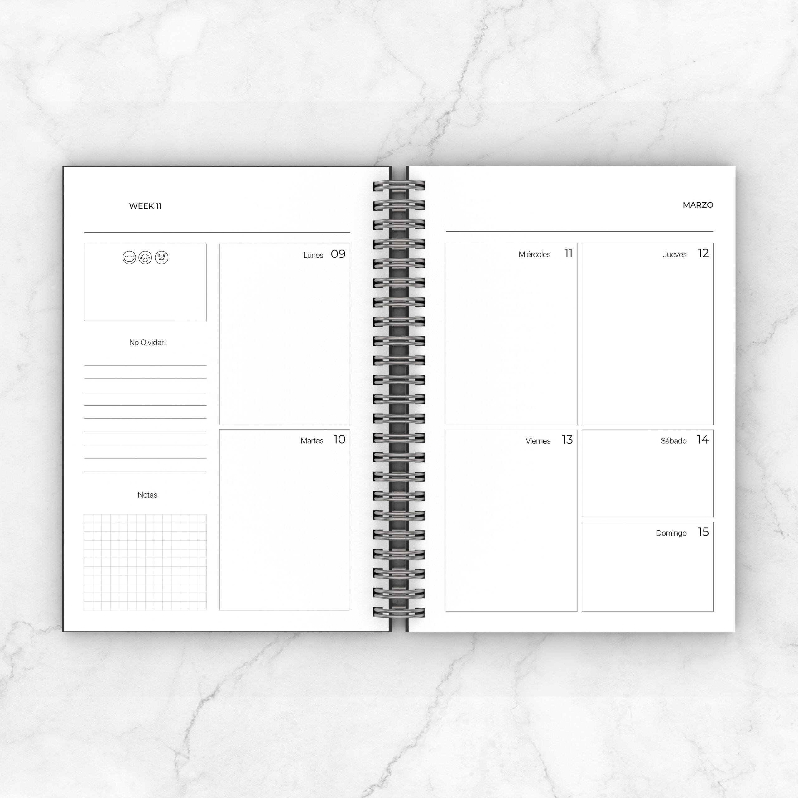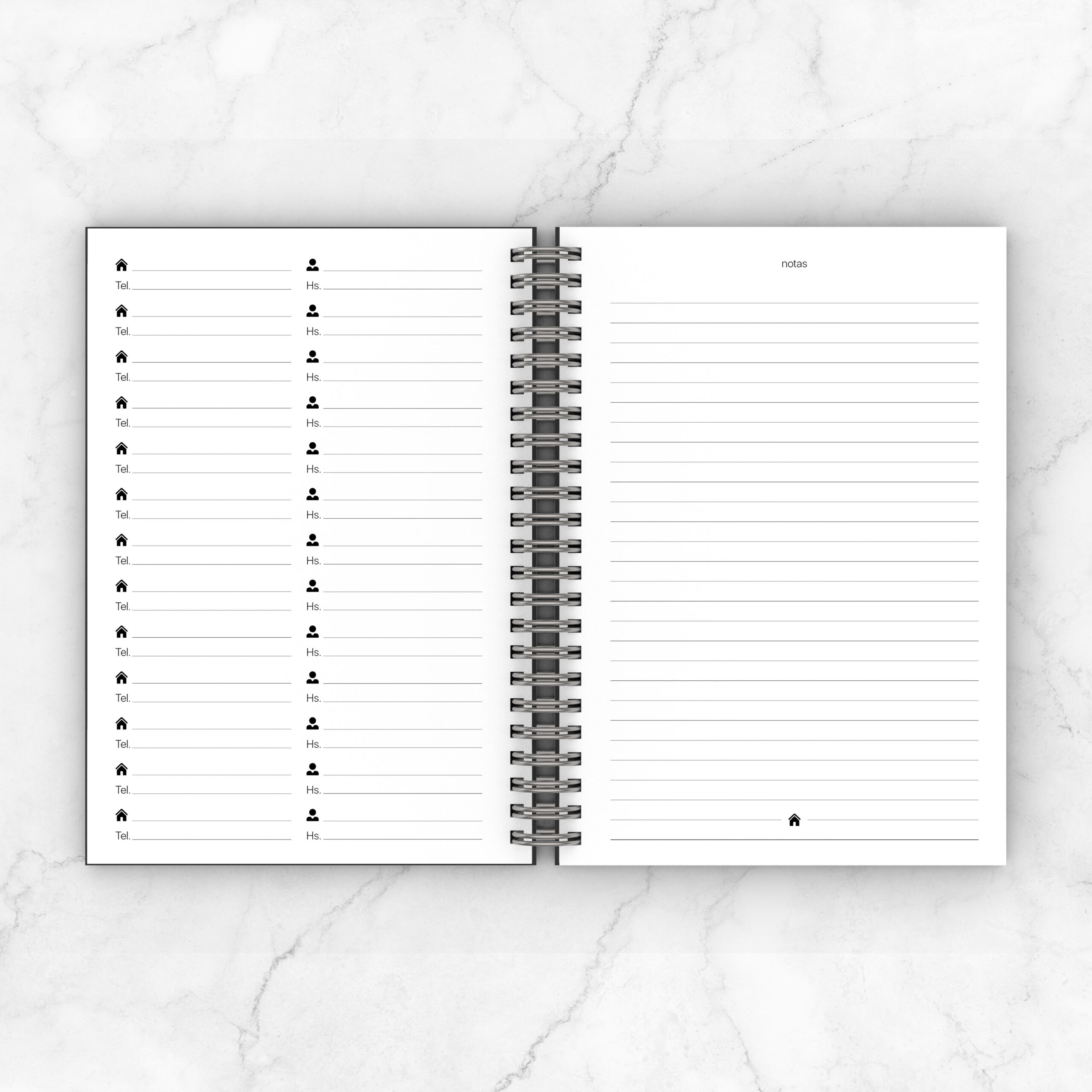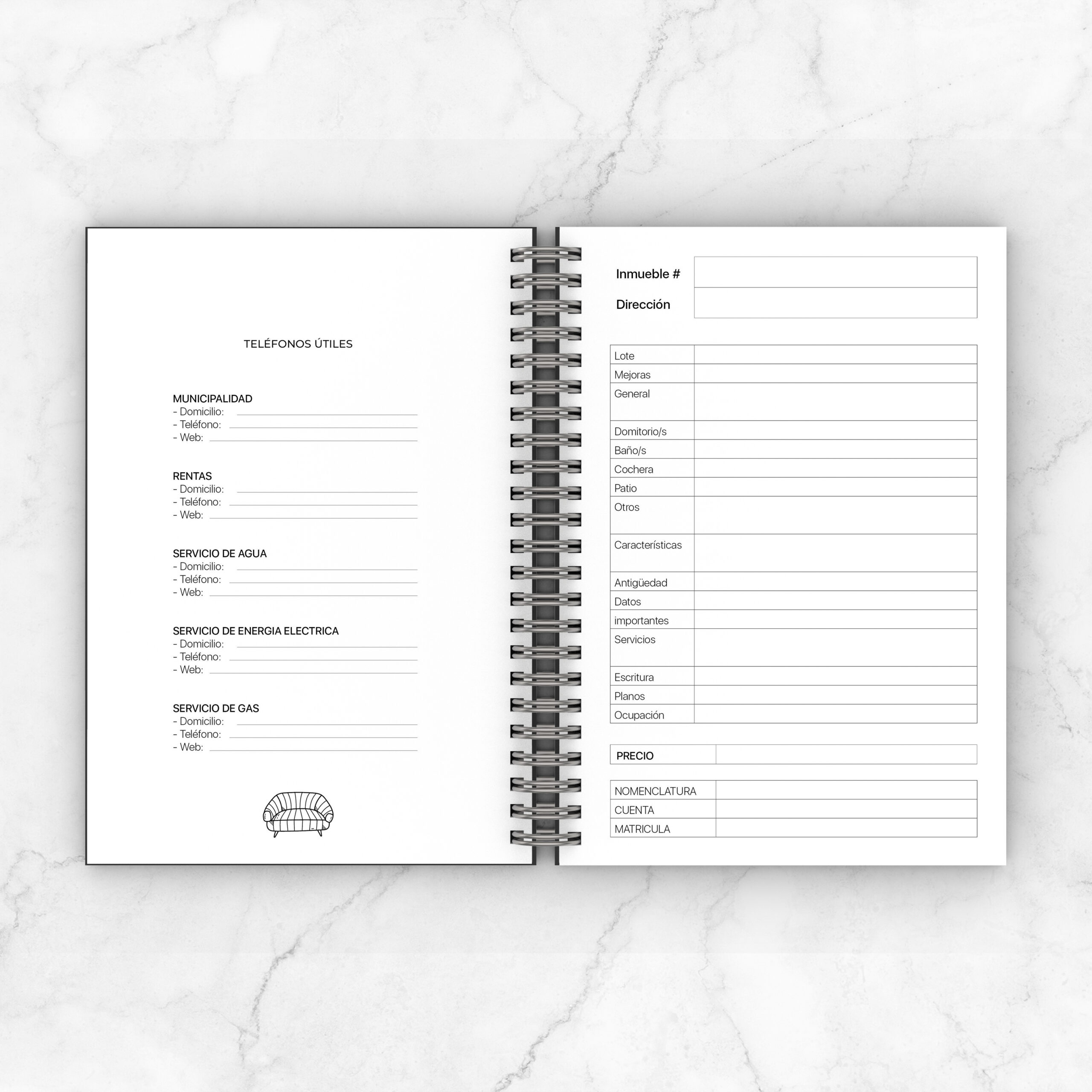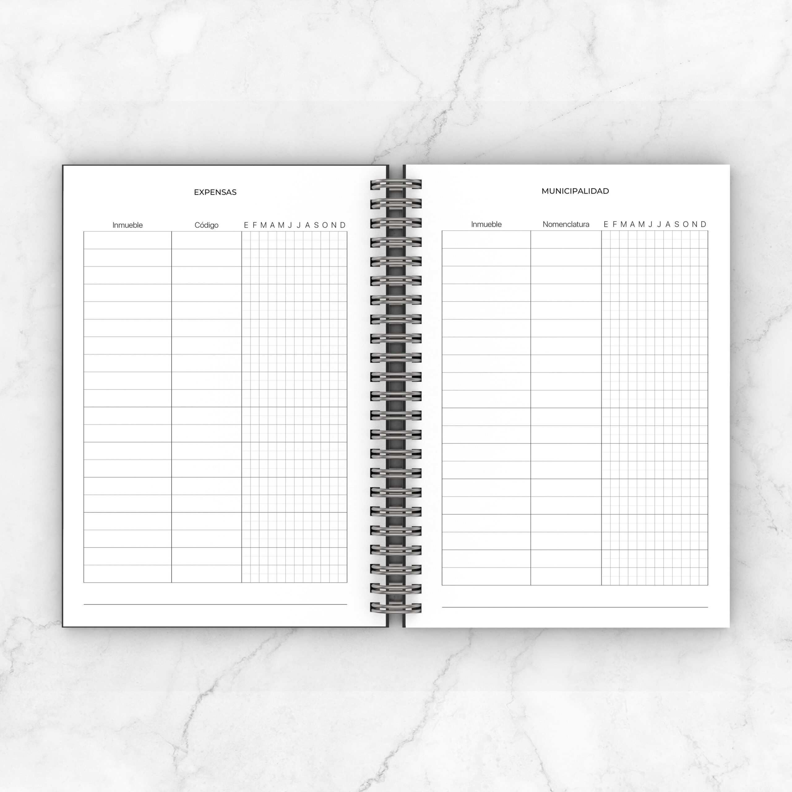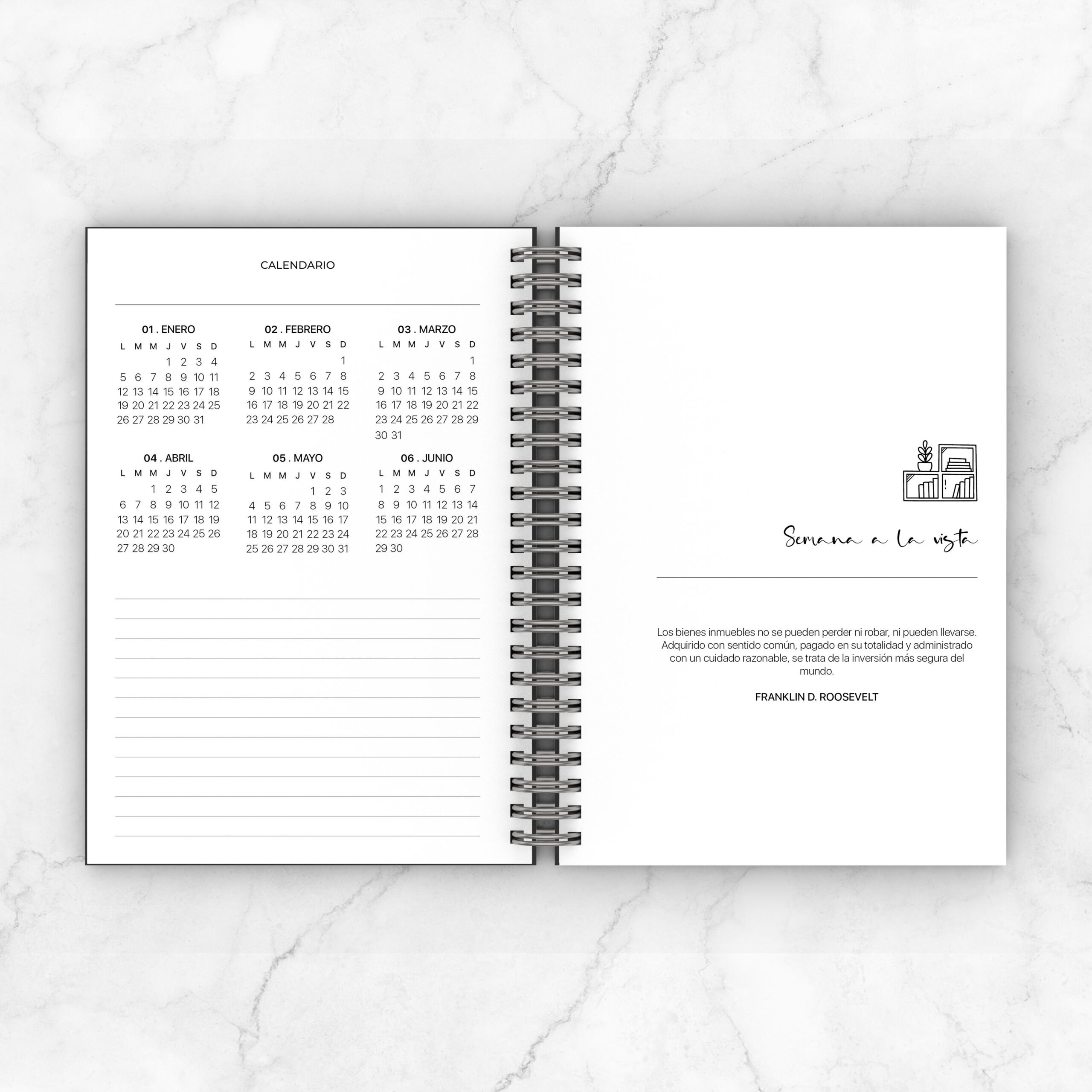 Info personal y comercial / Calendario / Fechas importantes / Agenda semana a la vista, con indicador de estado de ánimo de la semana, no olvidas y notas semanales / Pagos de impuestos y servicios de propiedades administradas con casilleros para marcar cuando se imprimió y cuando se pagó / Teléfonos útiles / Planillas para inmuebles a la venta / Indice de visitas a inmuebles / Notas