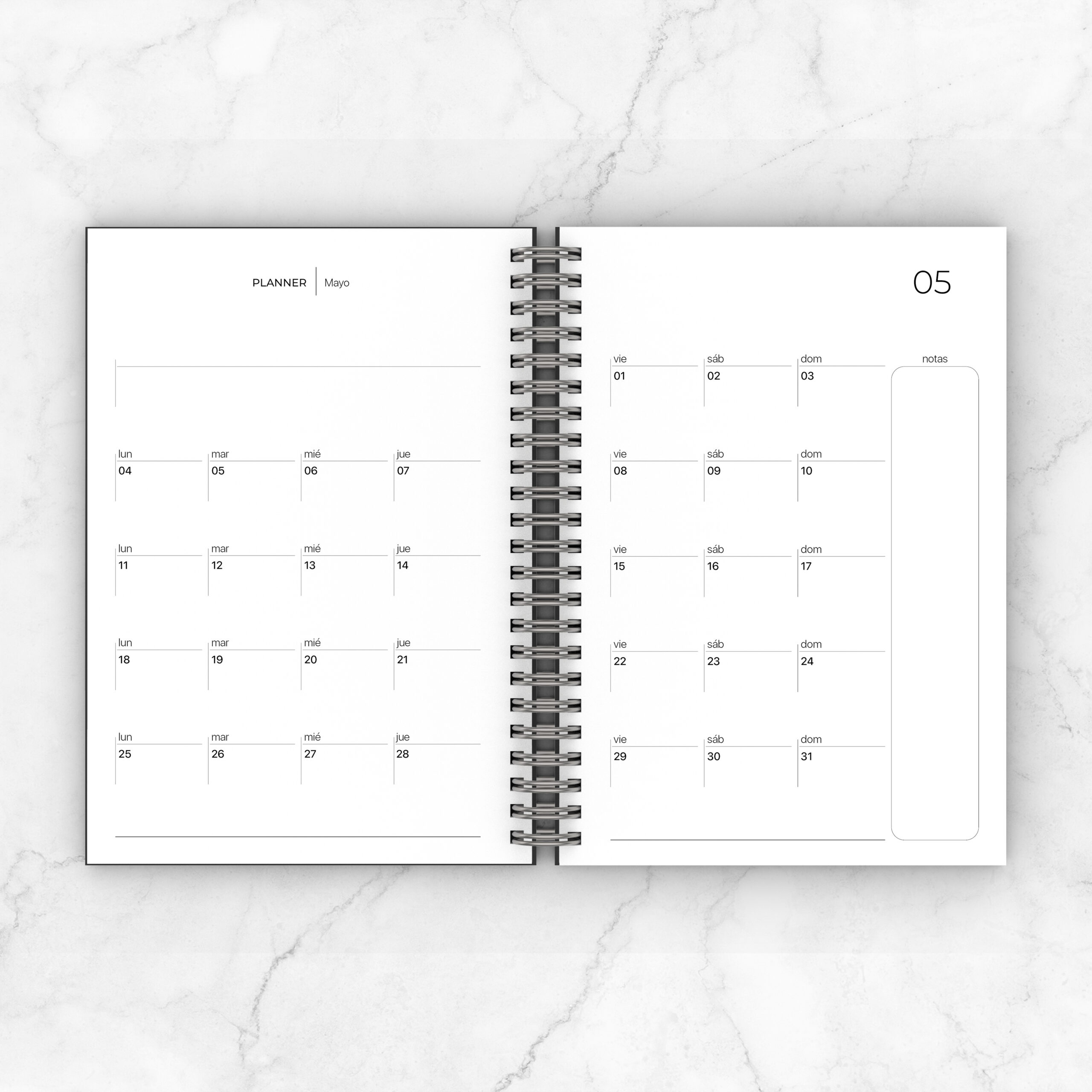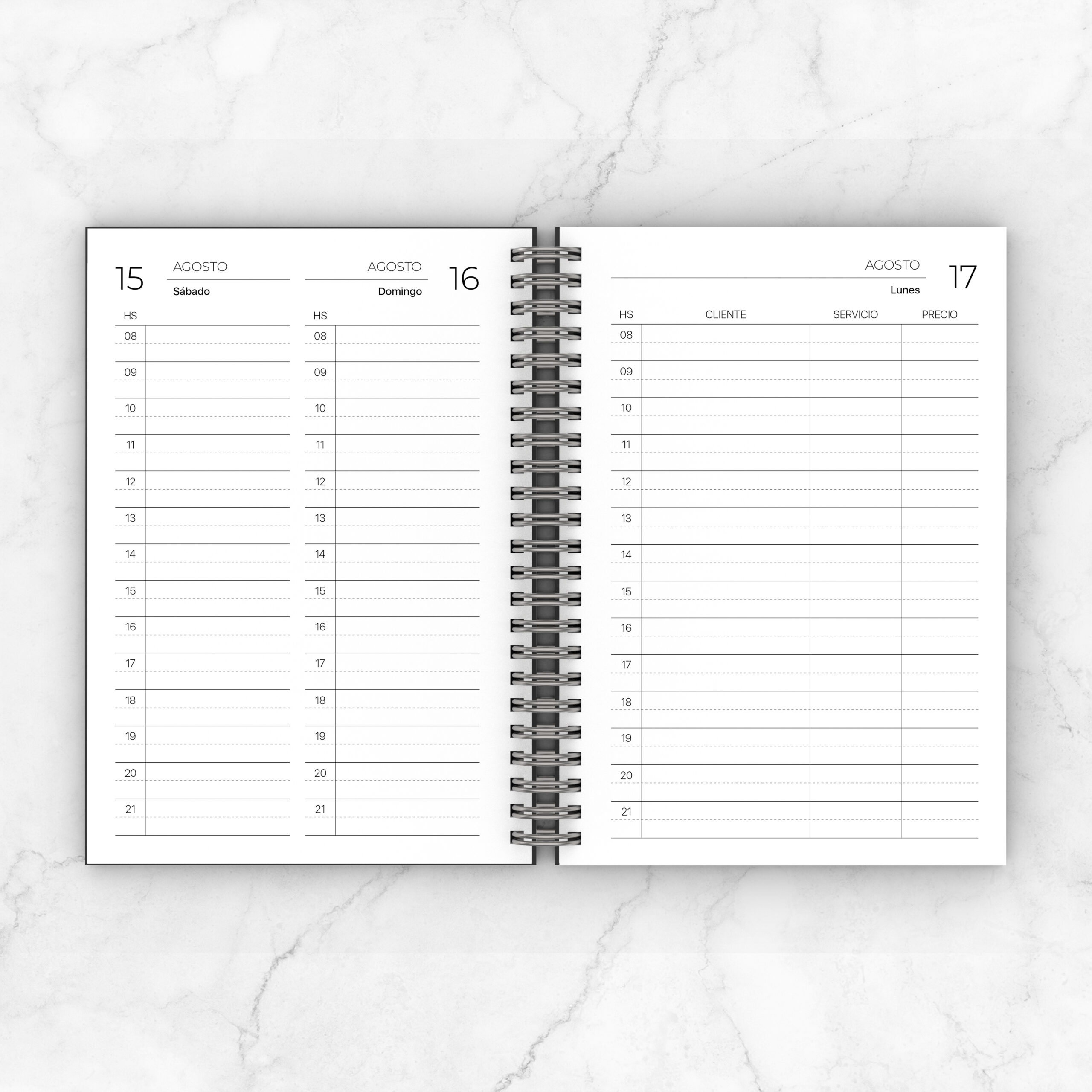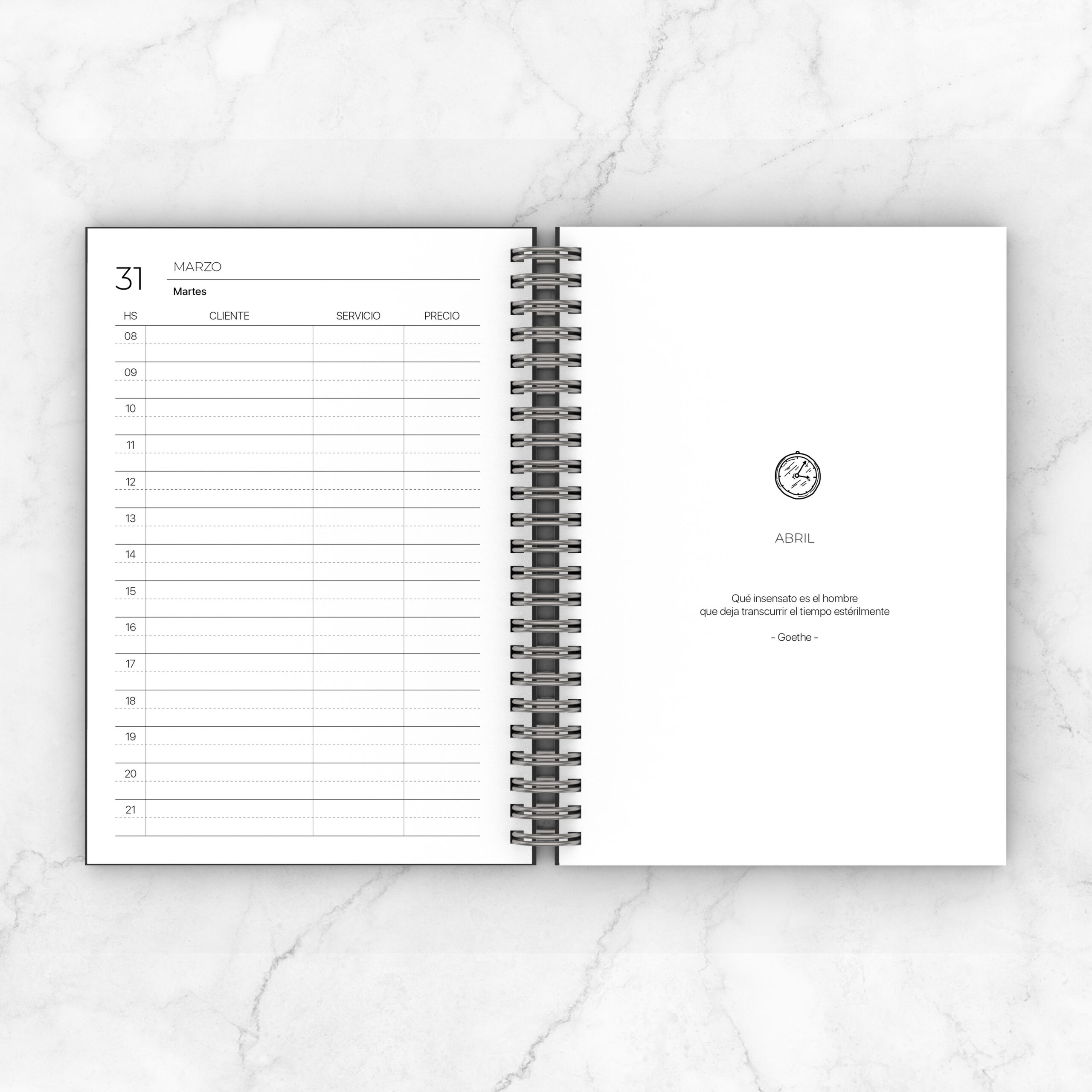 Datos personales y comerciales / Calendario anual / Carátulas mensuales con una frase sobre el tiempo cada una / Planners mensuales / Agenda diaria para turnos de 8 a 21hs, con especificación de cliente, servicio y precio / Hojas de notas