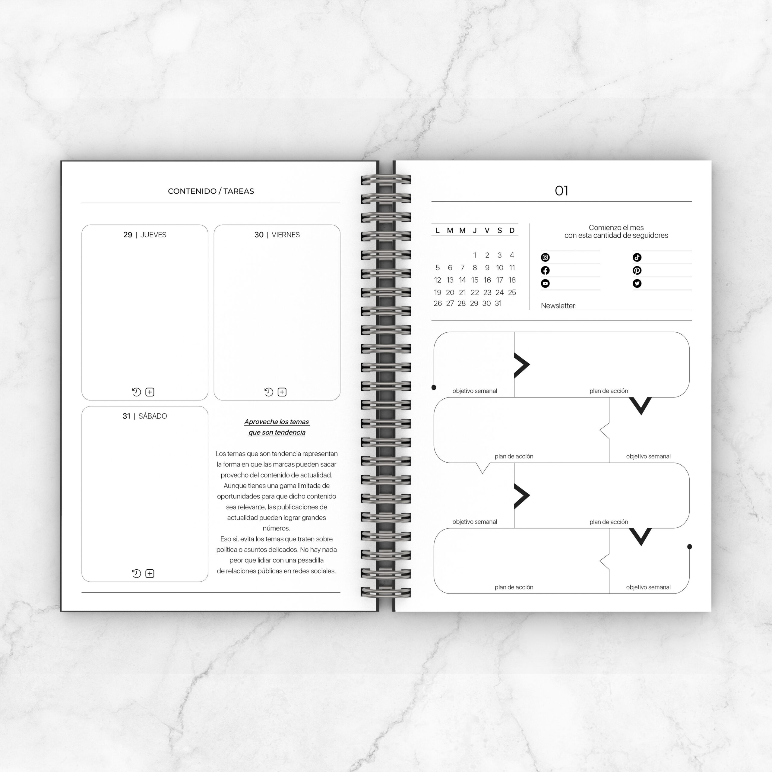 Datos personales y del emprendimiento / Misión, Visión y Valores de la marca / Planificador de redes sociales: calendario community manager con más de 700 fechas para celebrar o recordar, organización mensual con calendario, cantidad de seguidores, suscriptores de newsletter y los objetivos y plan de acción / Planner mensual con frase / Grilla de días para plasmar contenido creativo en las diferentes redes sociales / Planificador diario para los posteos pudiendo organizarlos por horario y formato de publicación, tips de marketing / Registro de ingresos y egresos / Compras / Ventas online / Lista de precios de insumos / Hojas de notas / Contacto de proveedores / Registro para 220 pedidos