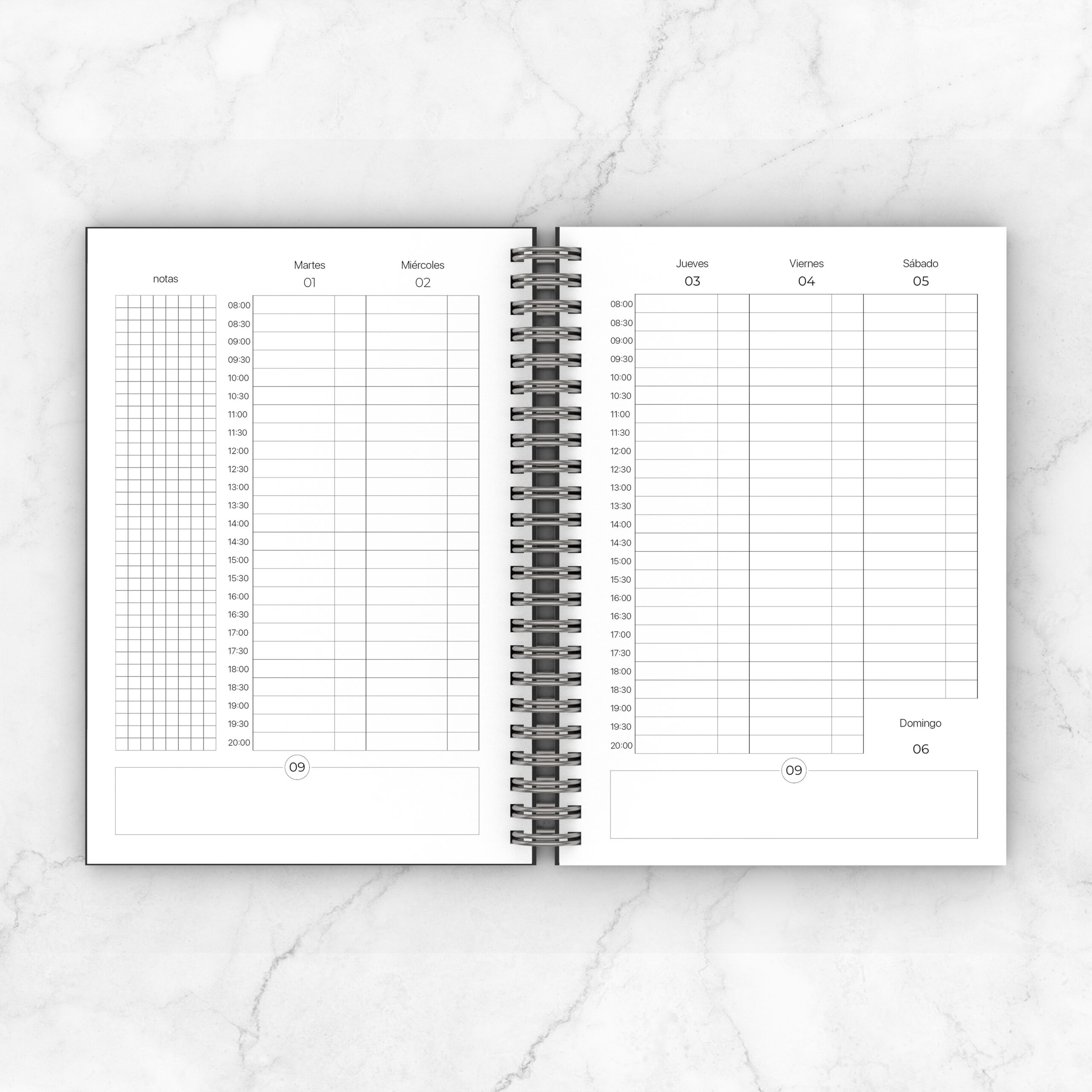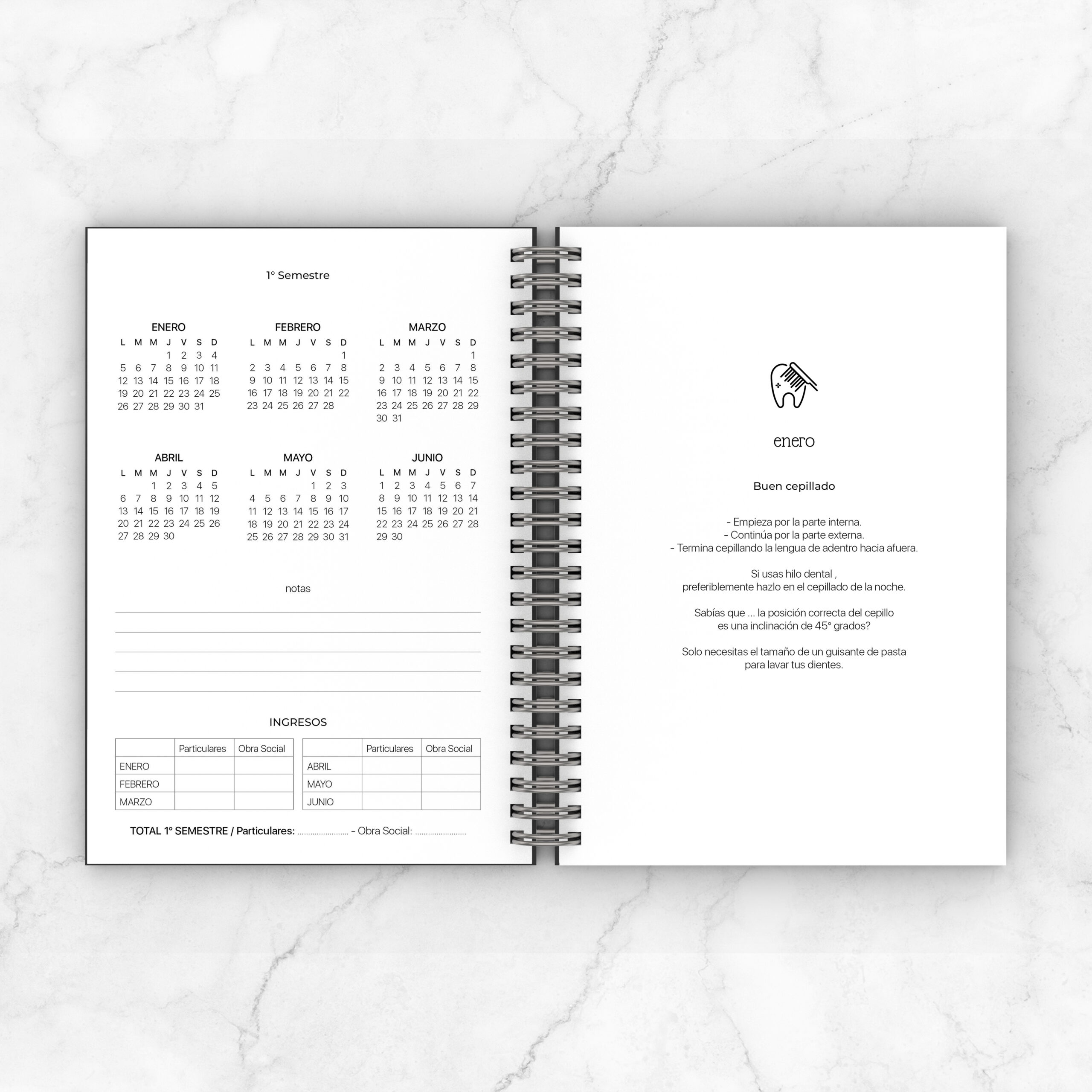 Datos personales / Calendario / Estadística de nuevos pacientes para declaración jurada anual / Cursos y Congresos / Carátulas mensuales con info de interés / Agenda semana a la vista con espacio para poner el costo de la consulta o tratamiento / Control de gastos mensual / Cuenta corriente para 100 pacientes / Hojas rayadas para notas / Contactos importantes