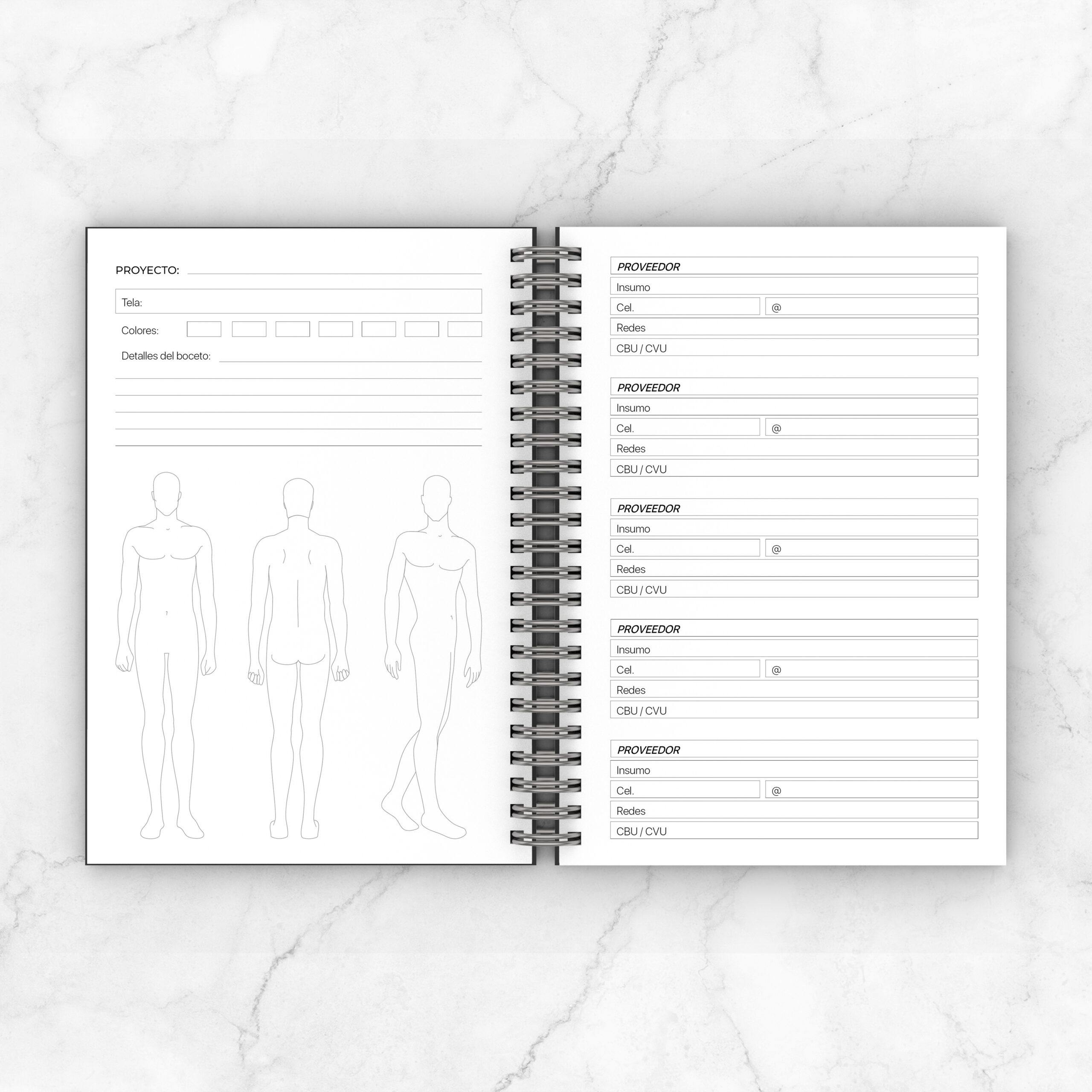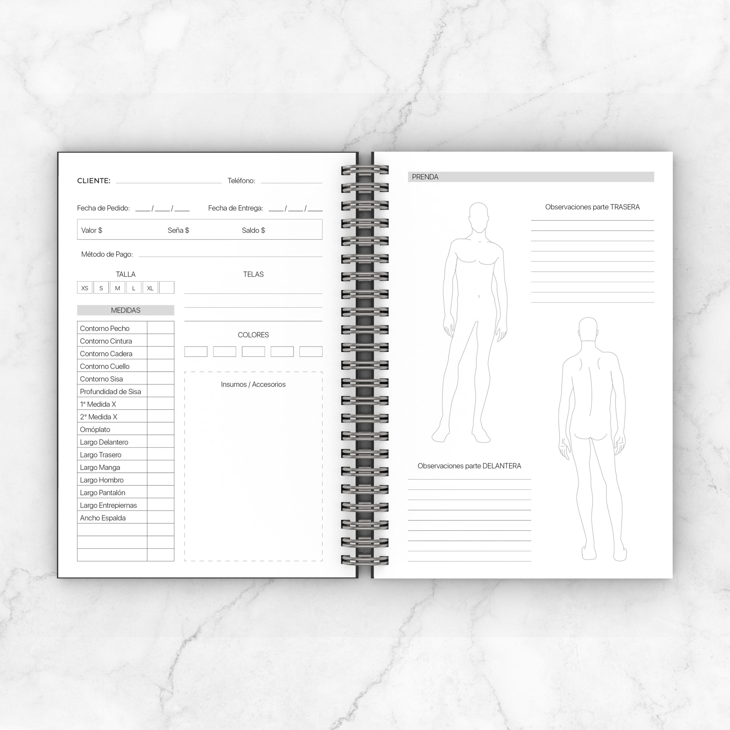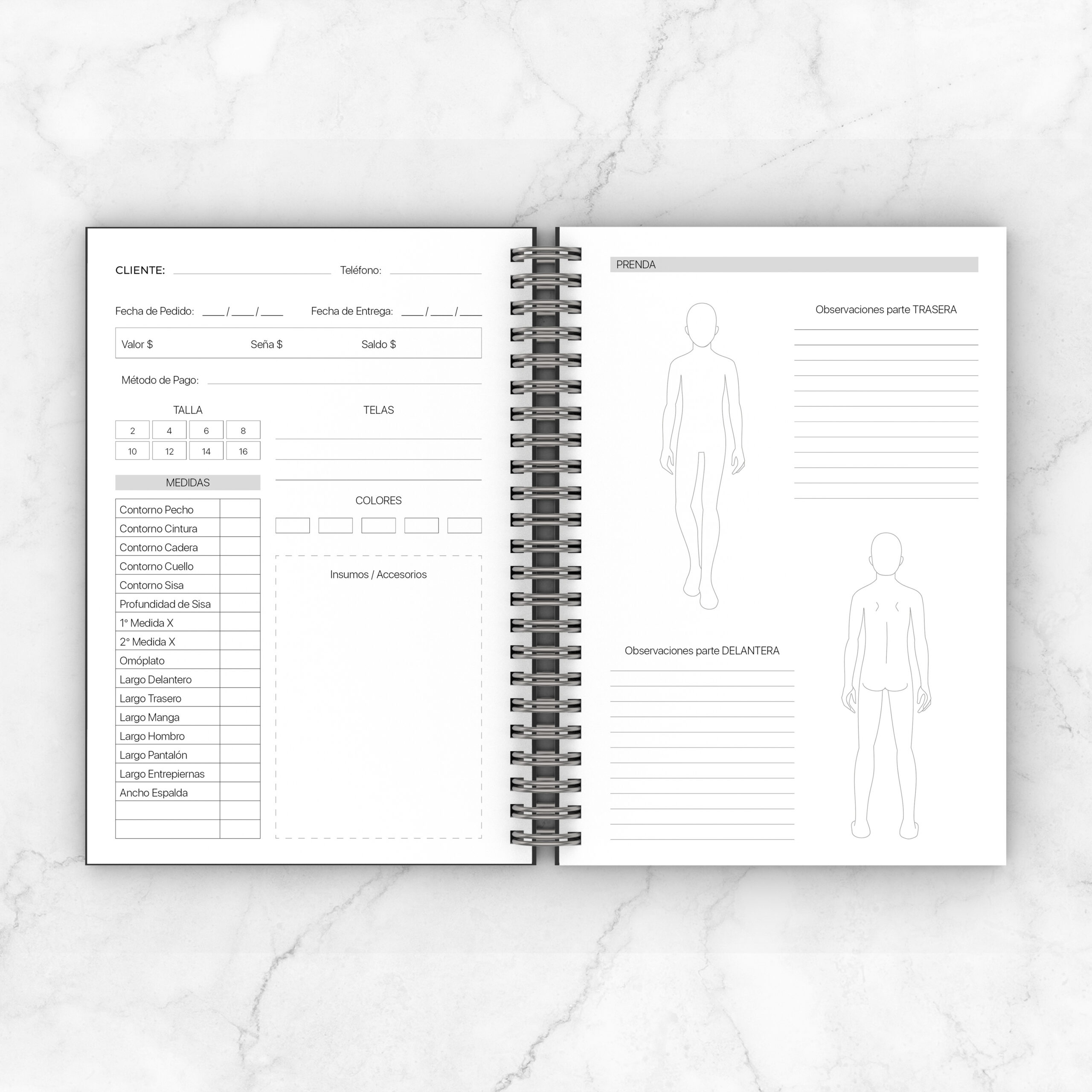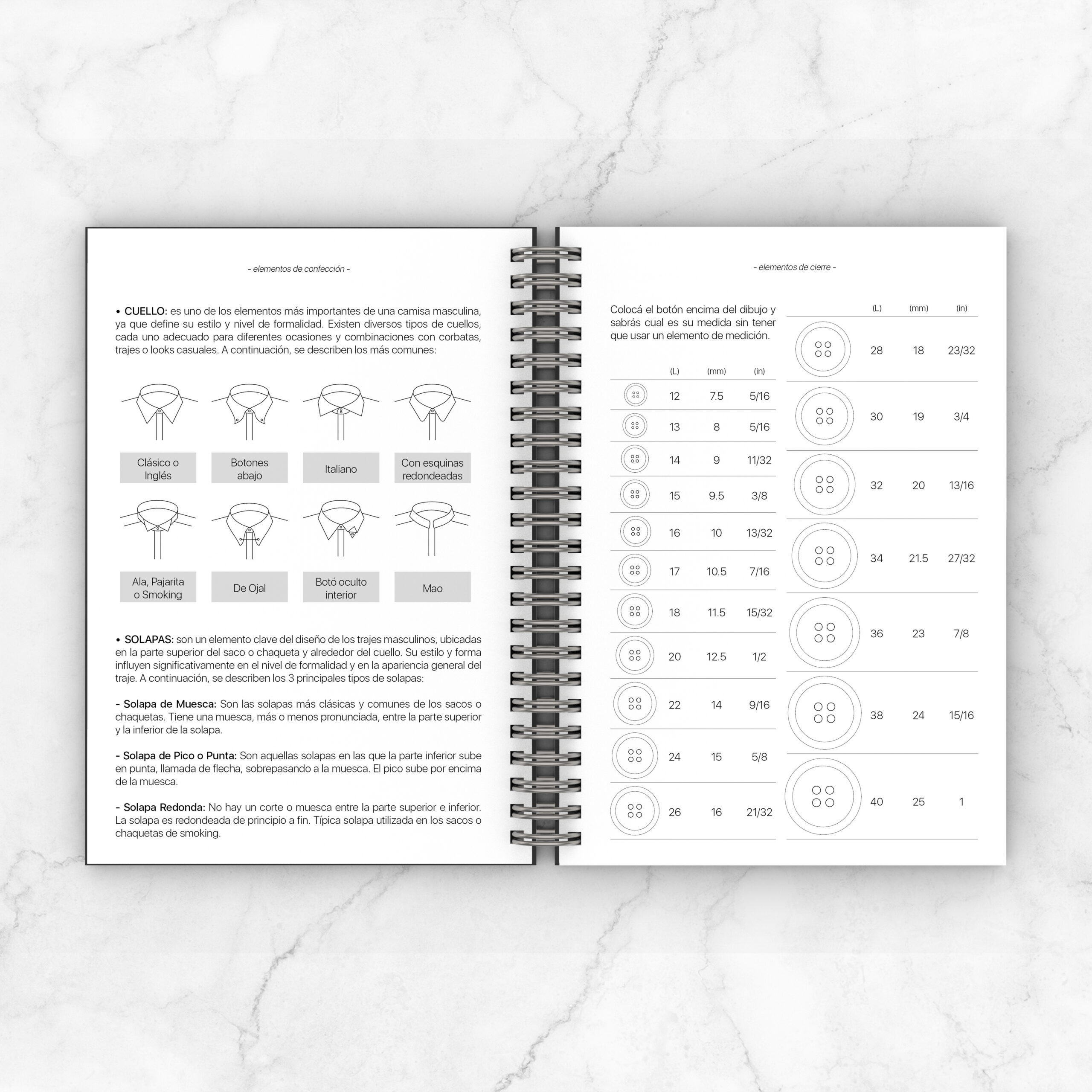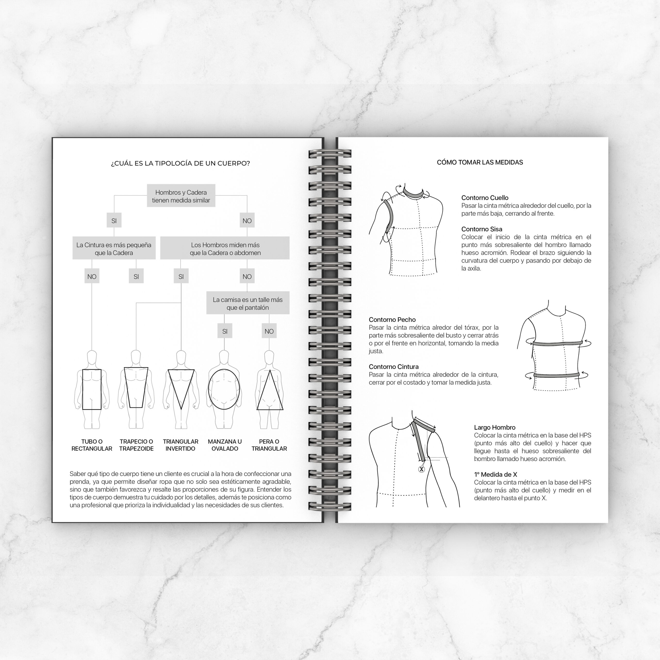 Tipología del cuerpo / Tabla medidas hombre-niño / Como tomar las medidas / Tabla de conversión medidas de longitud / Herramientas y Materiales / Textiles / Patronaje / Agujas de coser a mano y a máquina / Hilos de costura / Puntadas y Costuras / Elementos de confección: mangas y cuello de camisa, solapas de sacos / Elementos de cierre: cremalleras, botones con tabla de medidas y ojales / Agenda semanal / Costuras y Bocetos: espacio para registrar 55 trabajos + 20 bocetos propios de inspiración / Proveedores / Registro financiero de cada trabajo / Muestras de telas para pegar un retazo y especificar detalles / Hojas bullet journal