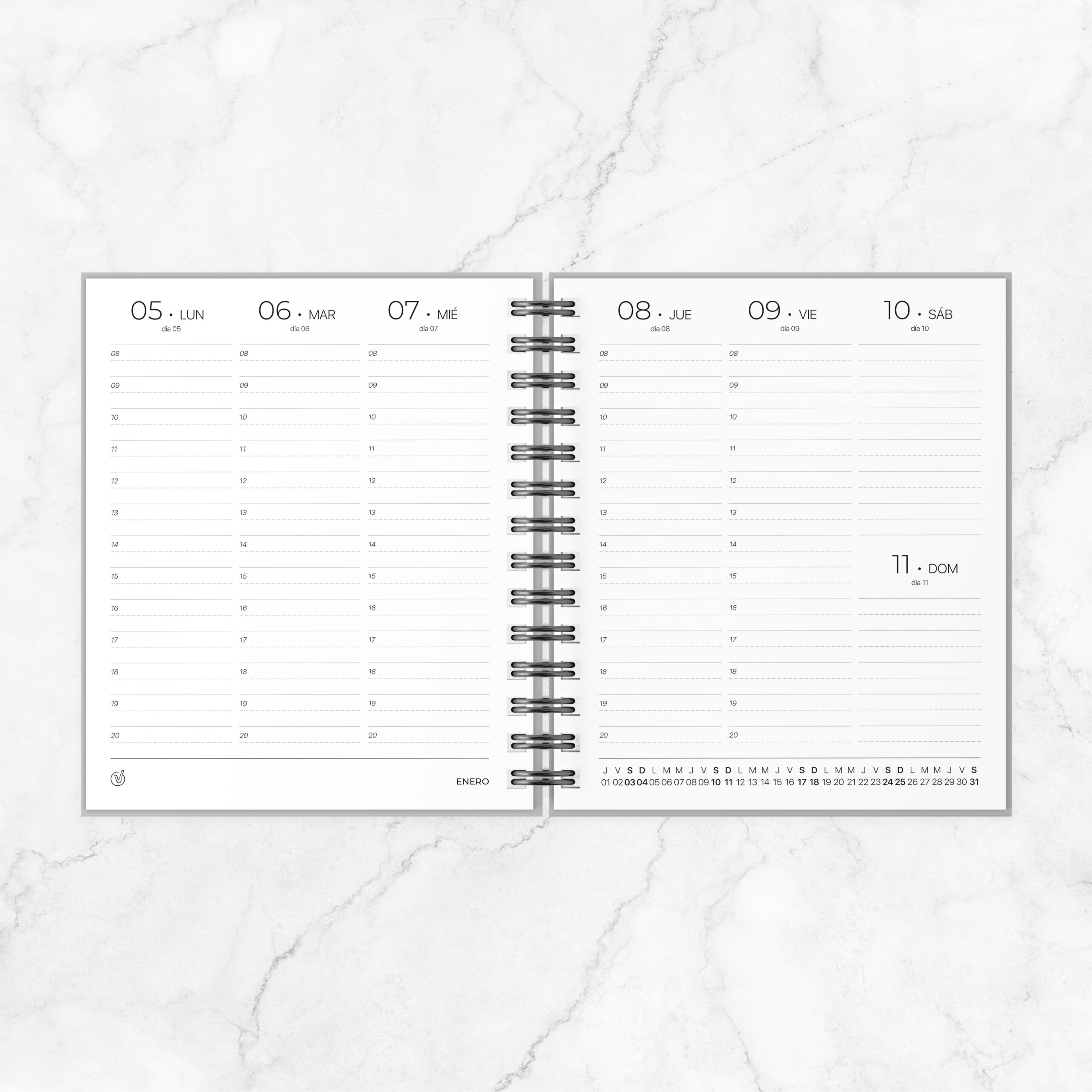 Datos personales / Metas del año / Calendario / Carátulas con calendario mensual, lunas, fechas importantes, prioridades, objetivos / Planner mensual / Ingresos y Egresos / Agenda semana a la vista con horarios de 8 a 20 hs., con calendario mensual horizontal, conteo de días / Hojas con renglones para notas
