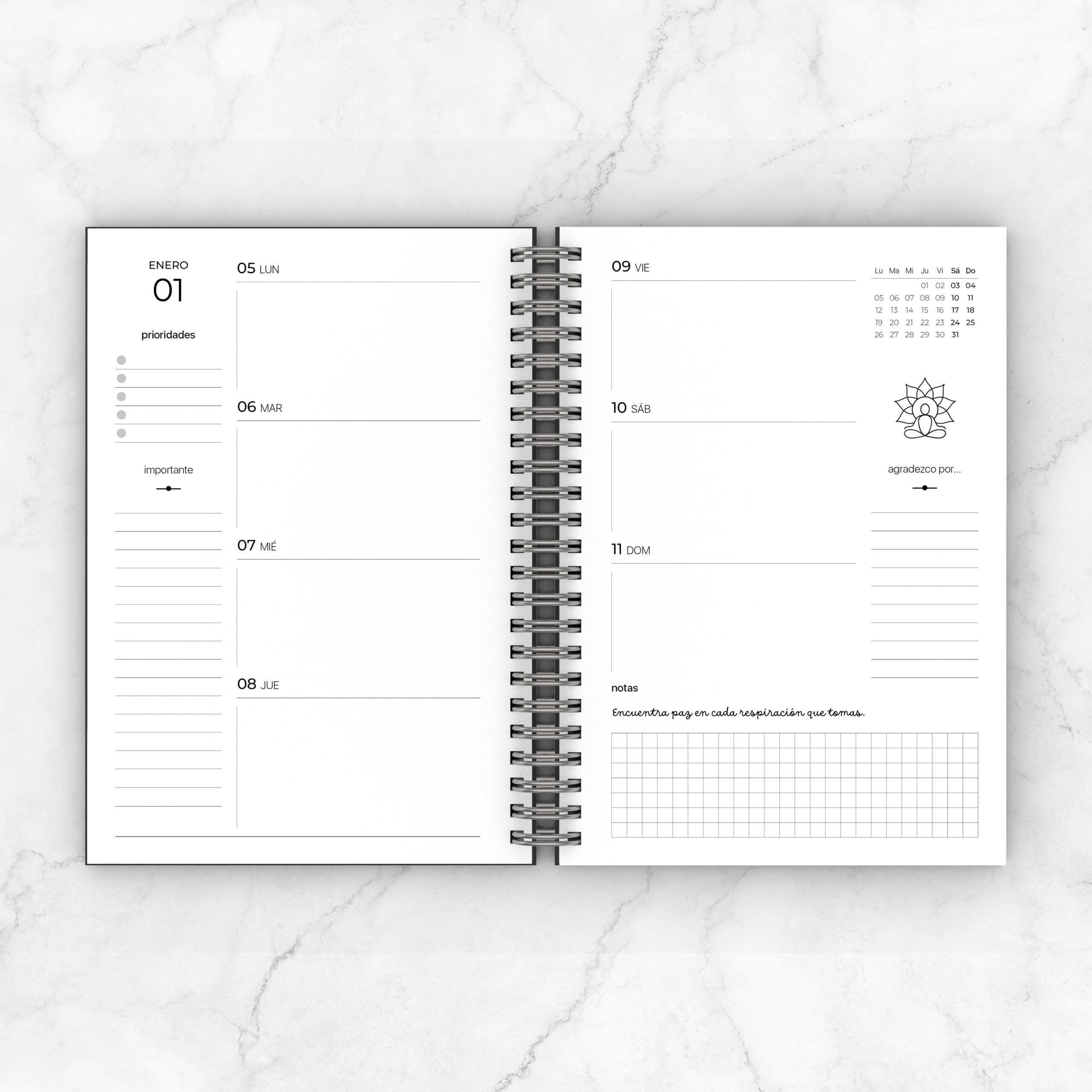 Lectura de inicio / Calendario / Namaste / Sánscrito / Yoga / Beneficios del yoga / Posturas / Respiración / Meditación / El árbol del yoga / Tipos de yoga / Saludo al sol / Creando un nuevo año / Mantras / OM / Mudras / Chakras / Japa Mala / Savasana / Carátulas mensuales con ilustración de postura, beneficios de la misma y forma de realizarla / Agenda semana a la vista con mini calendario y frase / Planners mensuales / Notas
