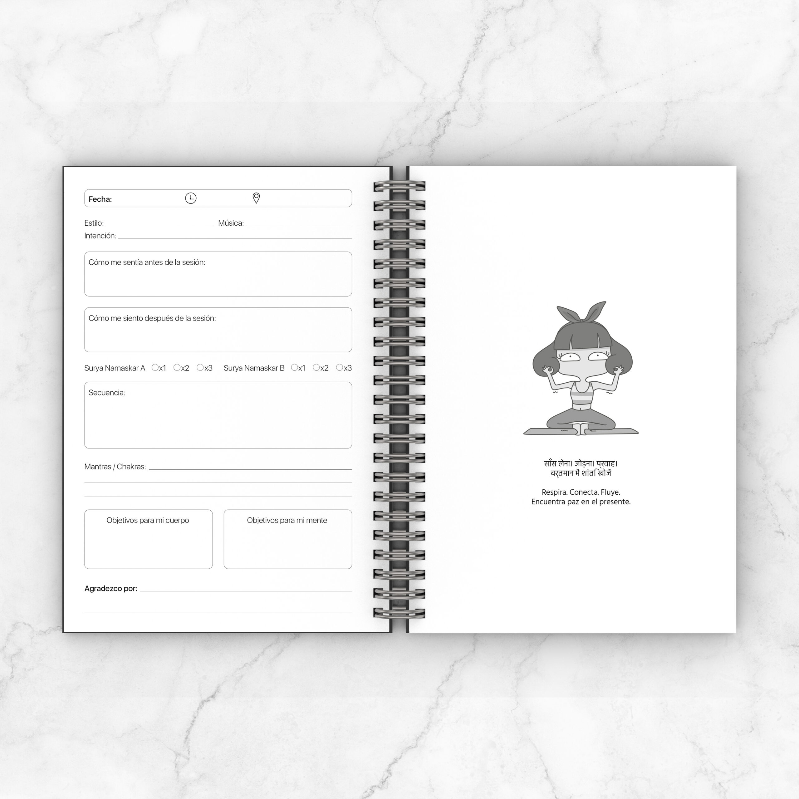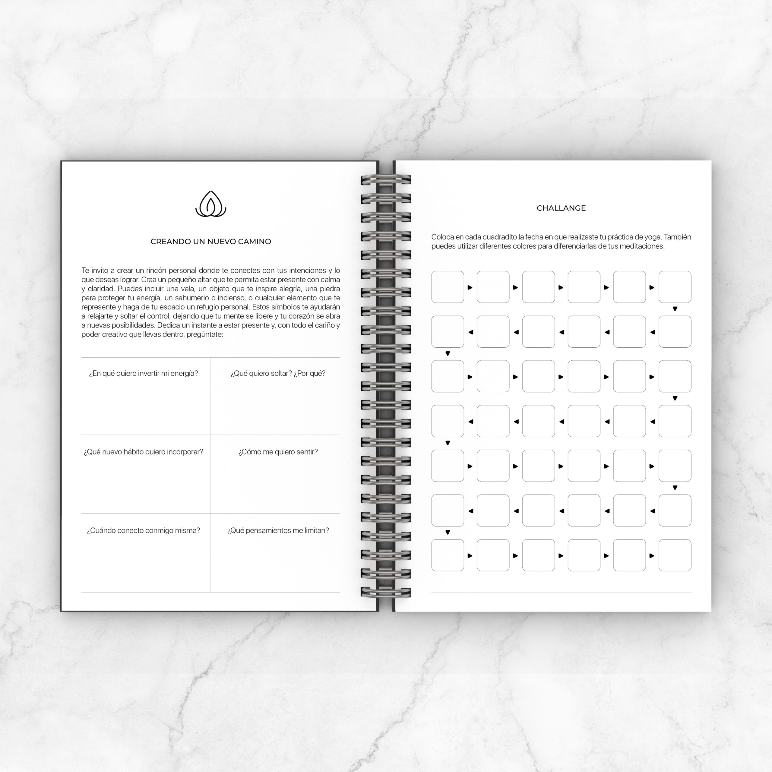 Lectura de inicio / Namaste / Sánscrito / Yoga / Beneficios del yoga / Posturas / Respiración / Meditación / El árbol del yoga / Tipos de yoga / Saludo al sol / Mantras / OM / Mudras / Chakras / Japa Mala / Savasana / Creando un nuevo camino / Challage / Registro de prácticas de yoga / Carta al universo / Notas