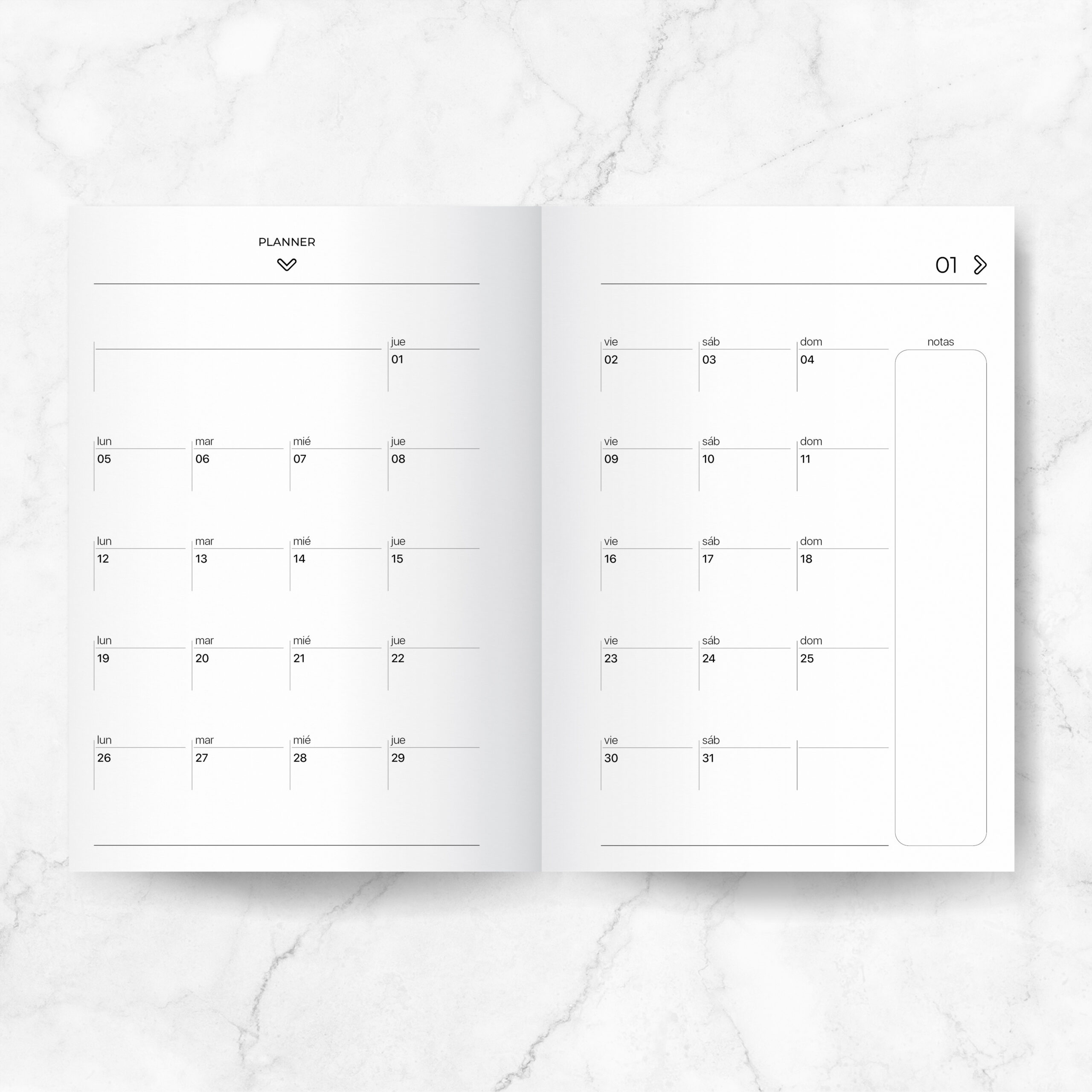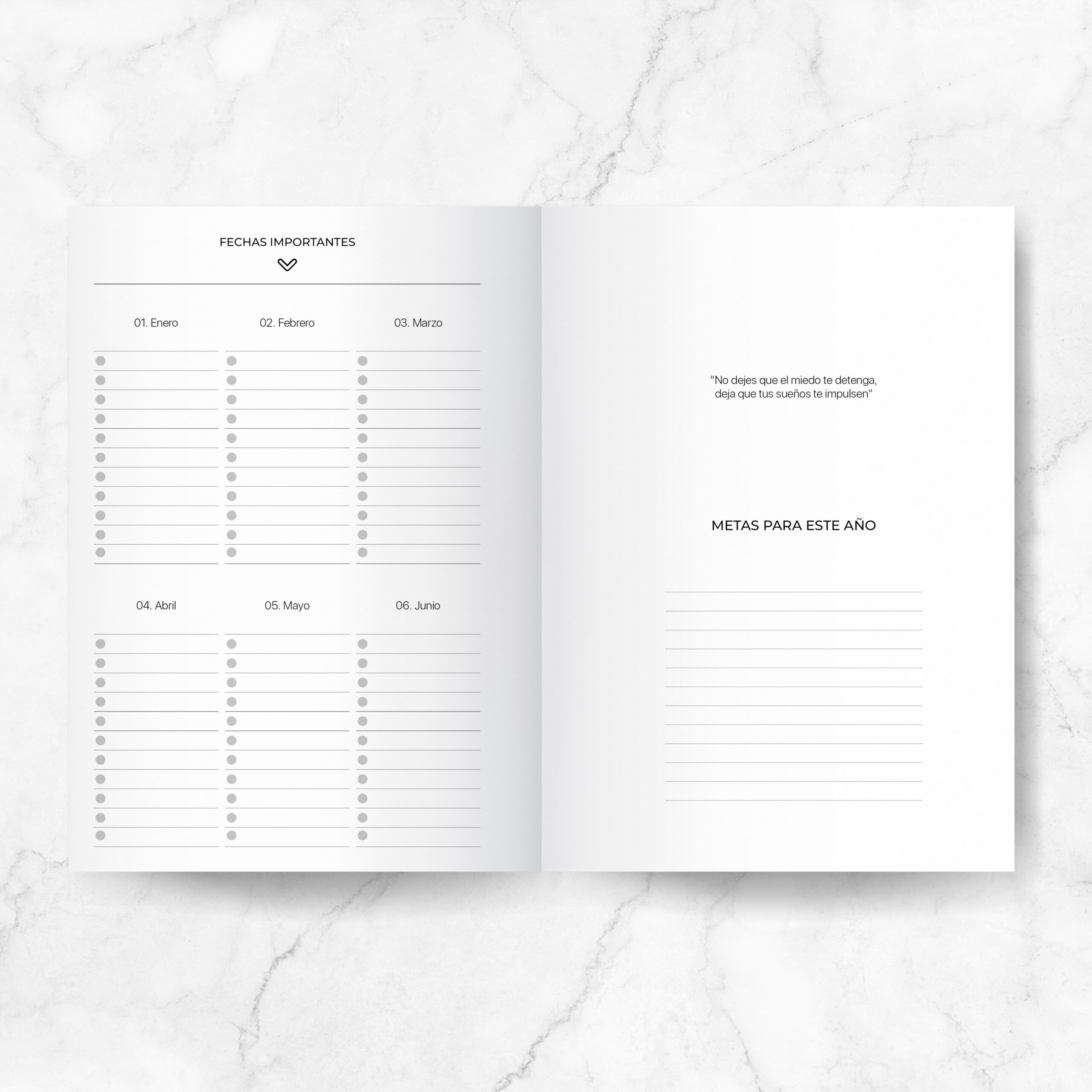 Metas para el año / Fechas importantes / Planner mensual, un mes en dos páginas